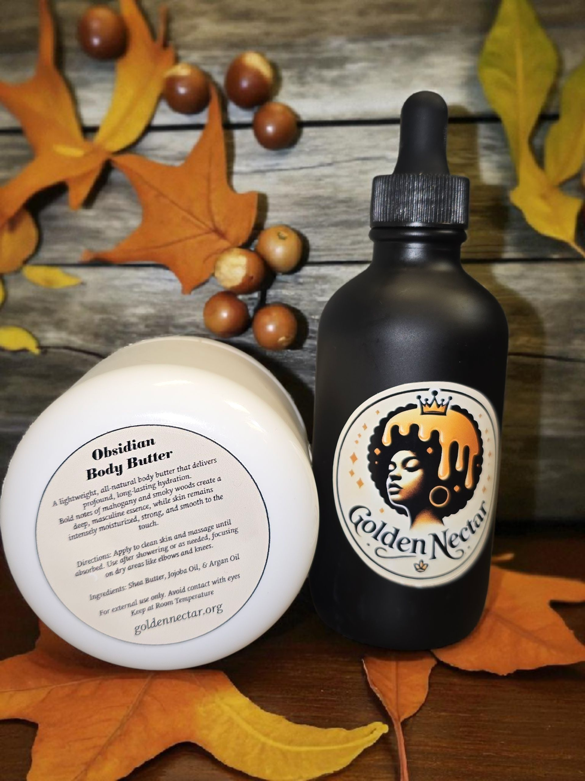 Step into strength and style with Obsidian Armor, the ultimate grooming duo designed to protect, nourish, and refine. This set pairs our conditioning Obsidian Beard Oil with our hydrating 4oz Obsidian Body Butter for complete care, from face to body.